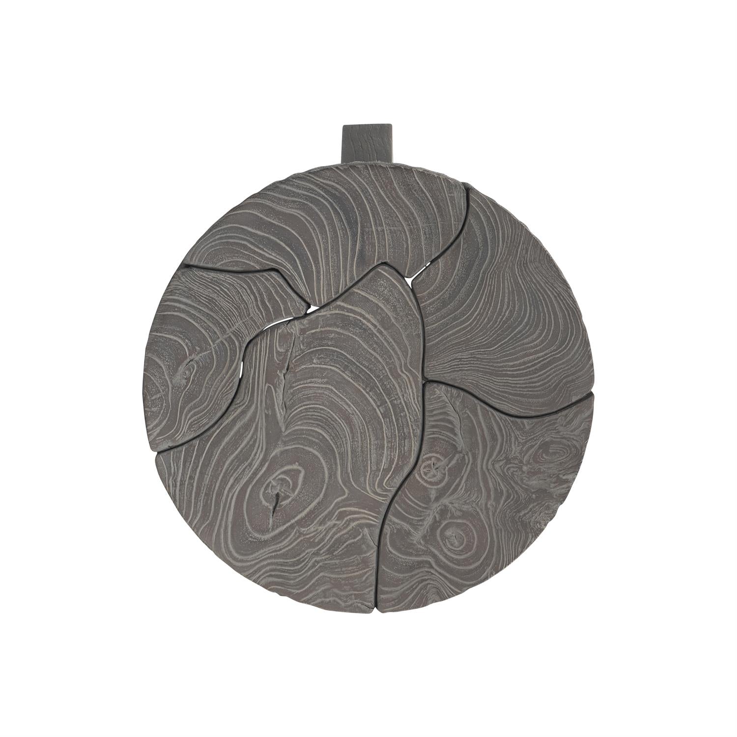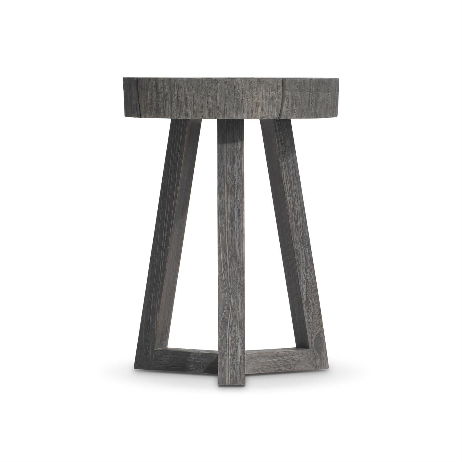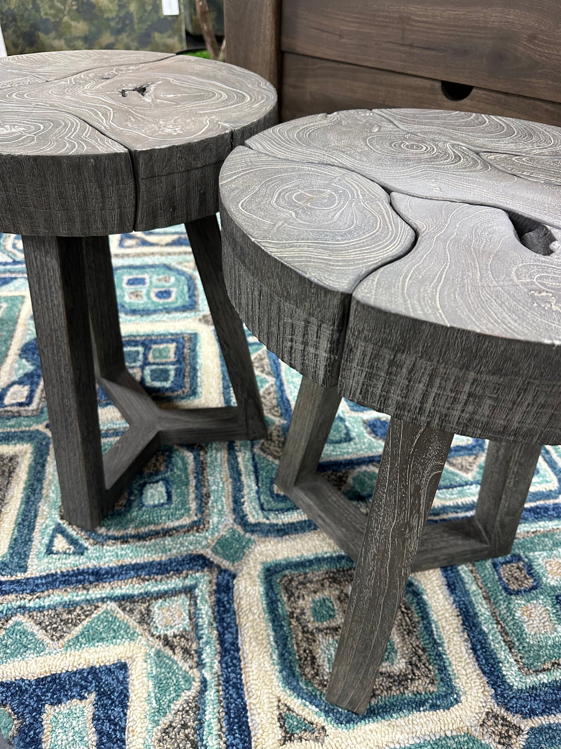 Textural, solid and modern, this side table boasts an eye-catching sliced teak top and slender legs for support.