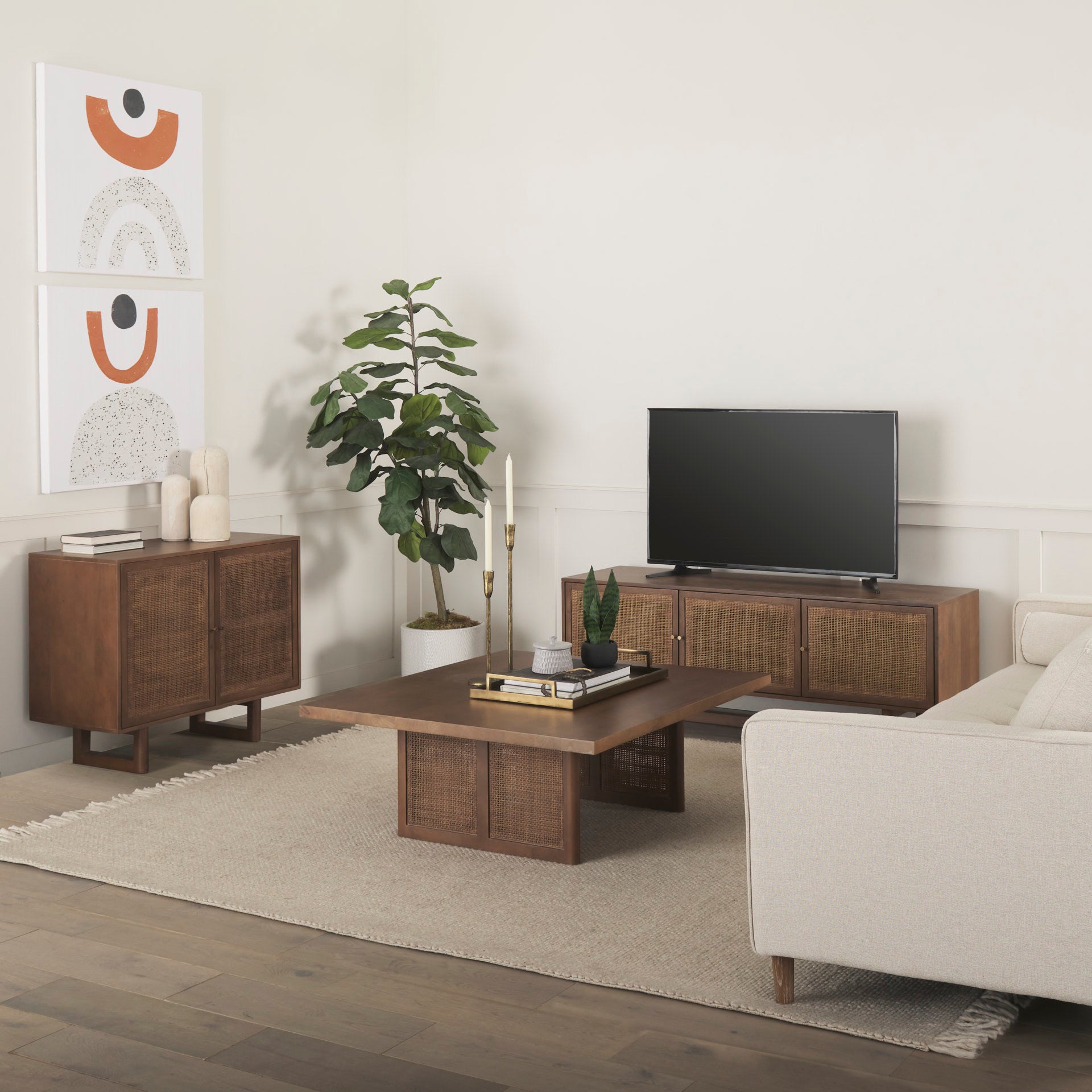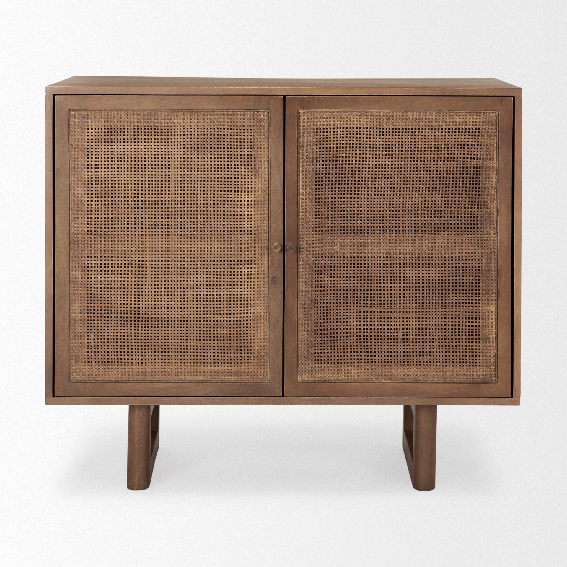 The Grier Accent Cabinet is made of solid mango wood, finished in a medium brown with two doors that feature a cane lattice front.